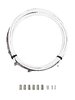Das Kit setzt sich zusammen aus geschmierter Zughülle, vorgedehnten Edelstahlzügen, Klemmhülsen, Rahmenschützern und Zugendkappen für Vorderrad- und Hinterradbremsen.