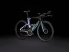 Einen ultraleichten Rahmen aus 800 Series OCLV Carbon, windschnittige Rohre mit Kammtail Virtual Foil-Profil (KVF), eine Speed Concept-Carbongabel mit aerodynamischem Profil, straßenglättendes IsoSpeed, integrierte Aufbewahrungslösungen für Verpflegung, Flüssigkeit und ein Pannenkit, einen drahtlosen elektronischen SRAM RED AXS 12fach-Antrieb mit SRAM AXS Blips-Schalthebeln, einen SRAM RED AXS-Powermeter, einen vollständig integrierten Lenker samt Vorbau, einen triathlonspezifischen Bontrager Hilo Pro-Carbonsattel für eine aggressive Aero-Sitzposition, zuverlässig zupackende Scheibenbremsen und aerodynamische Bontrager Aeolus RS